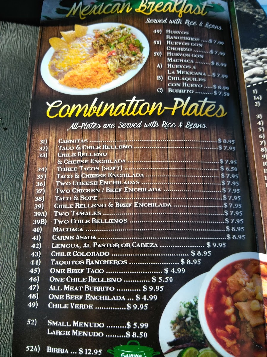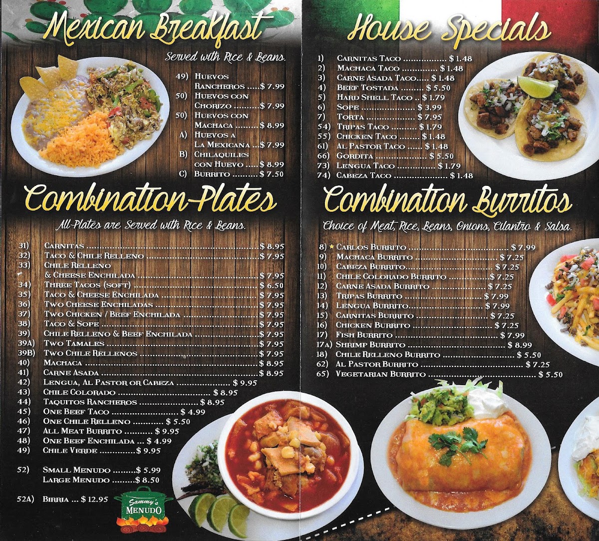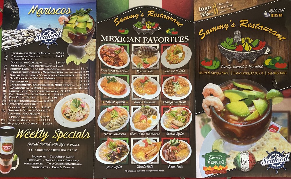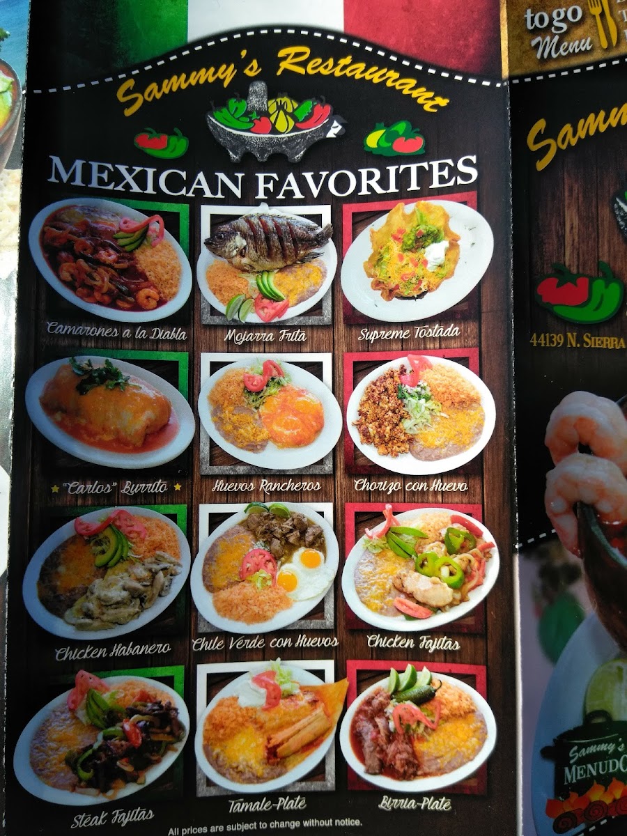 Welcome to Sammy's Restaurant in Lancaster, where authentic Mexican cuisine meets exceptional service. Nestled at 44139 Sierra Hwy, this culinary gem offers a vibrant menu featuring delicious breakfast options like Huevos Rancheros and Chilaquiles Con Huevo, all reasonably priced to delight your palate. The Mexican Favorites section boasts tantalizing dishes such as Steak Fajitas and Camarones A La Diabla, ensuring a memorable dining experience.